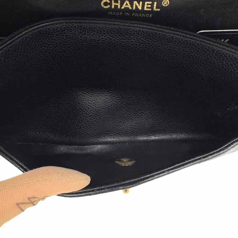 This authentic pre-owned Chanel Caviar Medium Double Flap features: caviar leather exterior, leather lined interior, gold-color hardware, adjustable leather woven chain straps for shoulder carry, turn-lock flap closure, interior double pocket, interior zip pocket, exterior flat pocket on front, and exterior flat pocket on back.