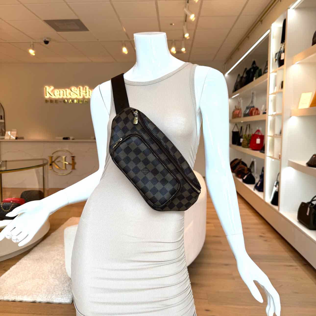 This pre-owned authentic Louis Vuitton Damier Ebene Melville Bum Bag features: coated canvas, brushed brass hardware, zipped closure, nylon adjustable waist strap, front and back zipper compartments.