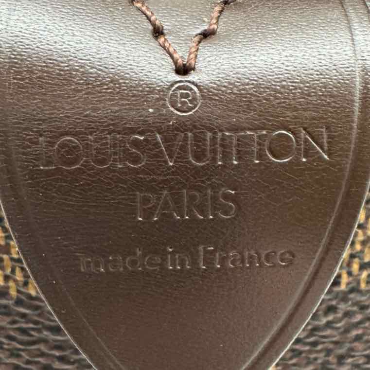 This authentic pre-owned Louis Vuitton Damier Ebene Speedy 25 features: damier ebene coated canvas exterior, zip closure, rolled top handles for hand carry, and interior zip pocket.