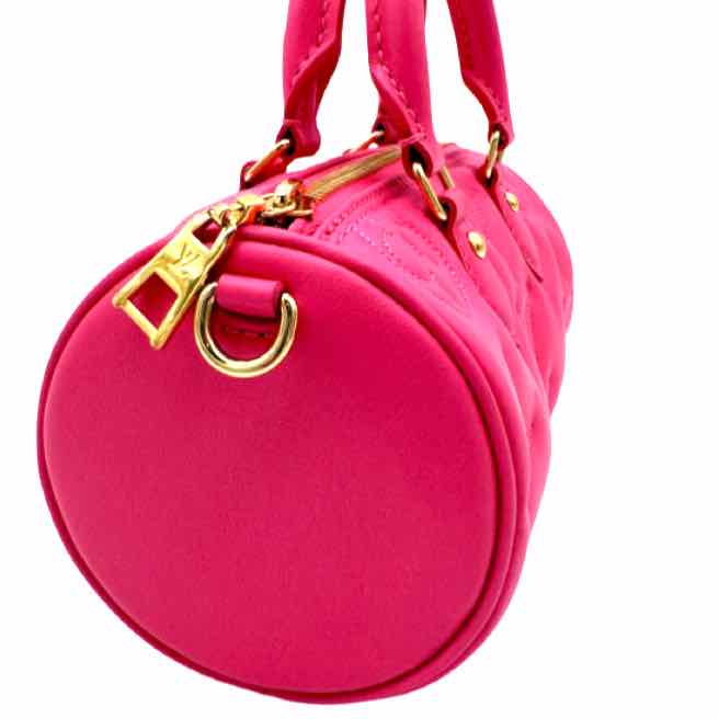 This pre-owned authentic Louis Vuitton Monogram Bubblegram Papillon BB pink handbag features: quilted and embroidered leather, jacquard with nano monogram lining, gold-color hardware, two top handles for hand carry, adjustable and removable nylon strap, optional chain, zip closure, interior flat pocket.
